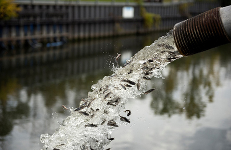 Releasing channel catfish into the river. Photo courtesy of the MWRD.
